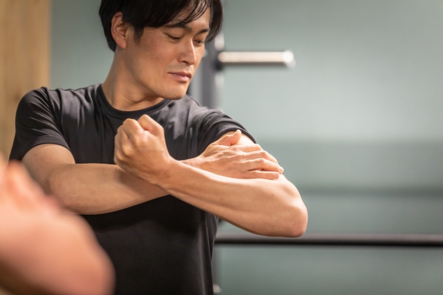 座っておこなうことで、立った時と比べて体幹を関与させる割合が少なくなるため、より肩周りの動きに集中しやすくなります。