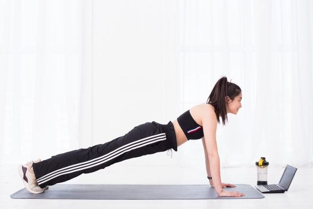 両脚を後ろへ伸ばしていくと同時に「腕立て伏せ」を行っていく動きは必須ではありません。自分の体力や集中したい部位に合わせて、体を沈めていくのか、またどの程度まで沈めていくのかを調整していきましょう。